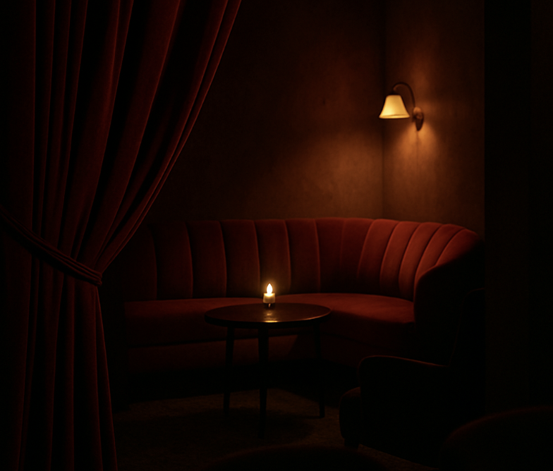 Behind the velvet curtain, the world hushed. The private suite smelled faintly of amber and wine. Red light warmed the corners, while silk sheets stretched across a low bed.