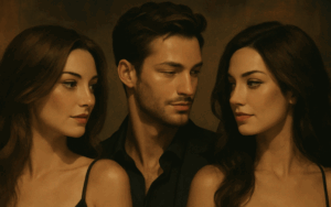 Sophie kissed Rhea first, pinning her gently to the wall. Noah stood behind them, his fingers slipping down Rhea’s spine, his mouth on her shoulder. Rhea moaned softly, caught between the two of them — familiar and new, rougher and softer.