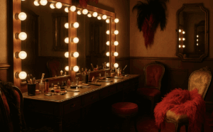 The dressing room was plush and narrow—mirrors everywhere, makeup scattered across the counter, feathered costumes draped over vintage chairs. Nicolette closed the door softly behind them, then turned and kissed Lucia—no hesitation, no doubt. Just heat.