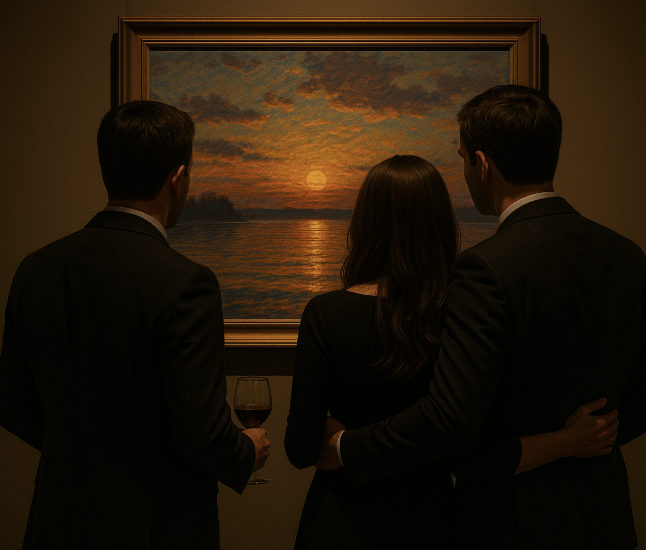 Maya and Daniel wandered through the modern art gallery, glasses of wine in hand. The space was quiet except for the soft shuffle of footsteps and murmurs. That’s when they noticed Julien, the gallery curator—sharp suit, easy smile, and a way of speaking about the art that made every piece sound like a secret.