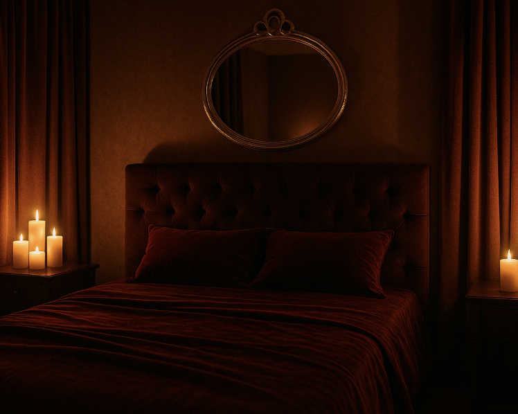 An hour later, the four of them slipped into one of the private rooms — candlelit, velvet draped, a mirror above the bed.