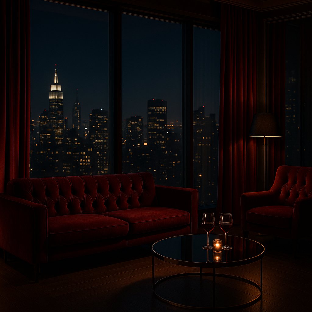 The suite was all velvet, glass, and city lights. Floor-to-ceiling windows looked out over the skyline, but no one was paying attention to the view.