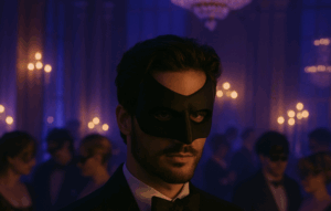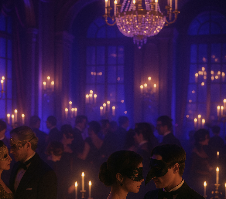 The ballroom at the manor shimmered in candlelight, velvet shadows clinging to corners. Masks everywhere — wolves, angels, devils. Music pulsed softly beneath the murmurs and moans.