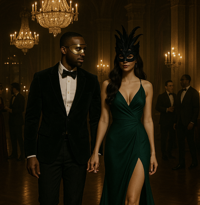 Mara and Lucien arrived fashionably late—he in a black velvet suit with a gold half-mask, she in a deep emerald dress slit to the hip, her mask feathered and feline. They weren’t strangers to these events. In fact, they’d helped plan the afterparty.