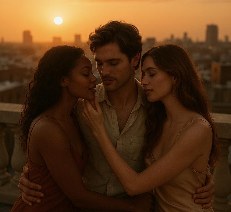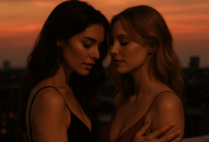 Lena, breathless from Zoe’s kiss, looked at Alex. The chemistry between them had always been undeniable, but now, standing on the rooftop with the city stretching out below them, it felt like a moment that could never be recreated. She stepped back, tugging at the hem of her shirt, exposing her bare skin to the night air. “I think I’m ready to see where this goes.”
