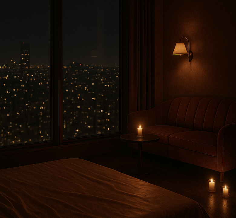 The hotel suite was warm with candlelight and the lingering scent of perfume. Floor-to-ceiling windows revealed the city below — glittering, indifferent. But inside, the air crackled.
