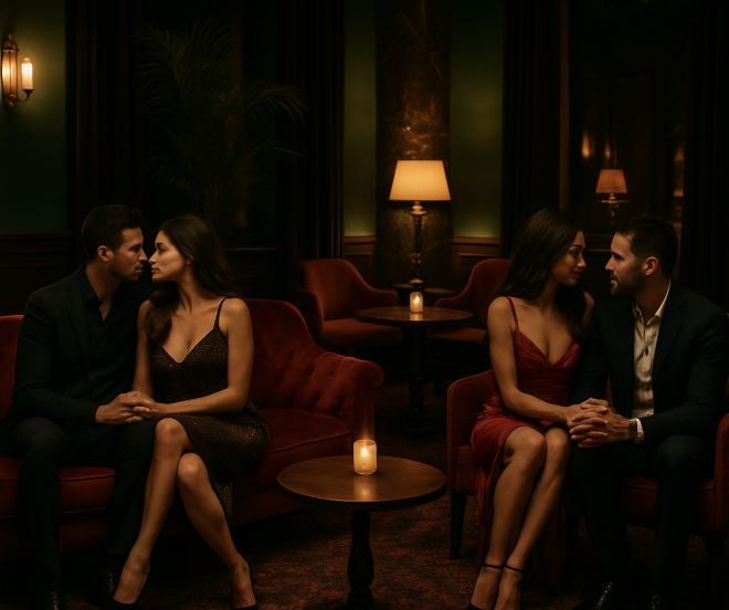Later, the couples drifted to a quieter corner. The music softened, the world shrinking to just the four of them. Their laughter came easier now, words punctuated by long pauses and lingering looks.