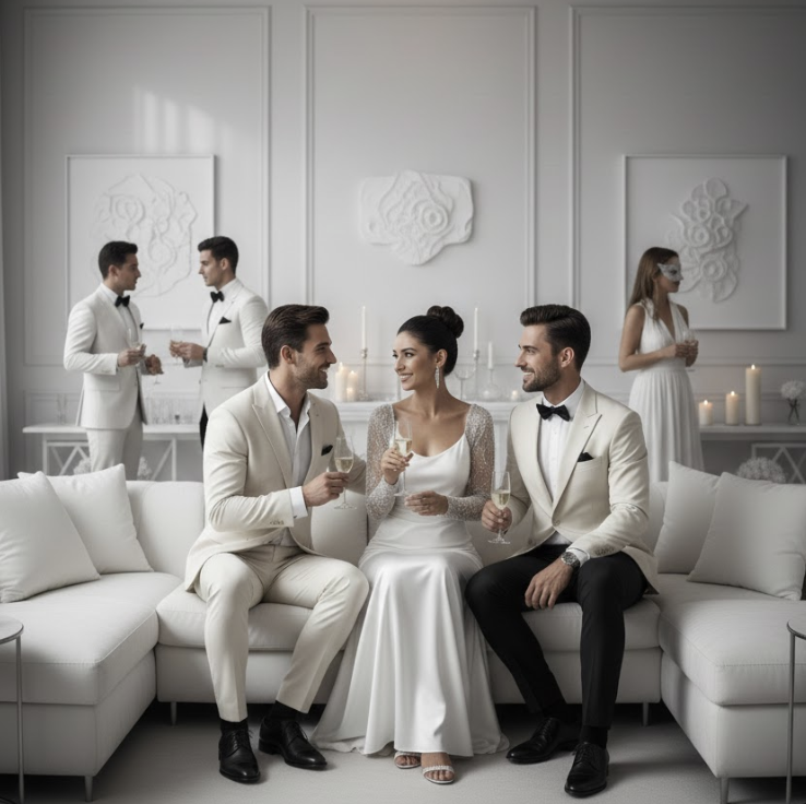 Personne ne se distingue par une couleur flamboyante. Le blanc met tout le monde à égalité, ce qui change profondément la dynamique sociale. Ce ne sont plus les tenues qui attirent l’œil, mais : la posture, le regard, les détails subtils, la manière de se déplacer, et la façon d’habiter l’espace. La séduction devient plus pure, plus intérieure.